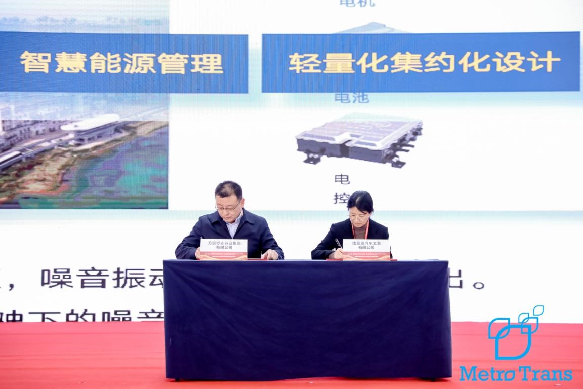 在高新技术成果战略合作签约会上,比亚迪轨道交通产业办公室主任纪晓萍和方圆标志认证集团有限公司绿碳事业部总经理李臣,在协会领导仲建华的见证下签署了战略合作协议。双方将针对低运量城市轨道交通运营服务绿色低碳评价展开合作研究,建立低运量城轨道交通运营服务绿色低碳评价技术体系,制定评价方案,为我国低运量轨道交通绿色可持续发展提供多维度支持。