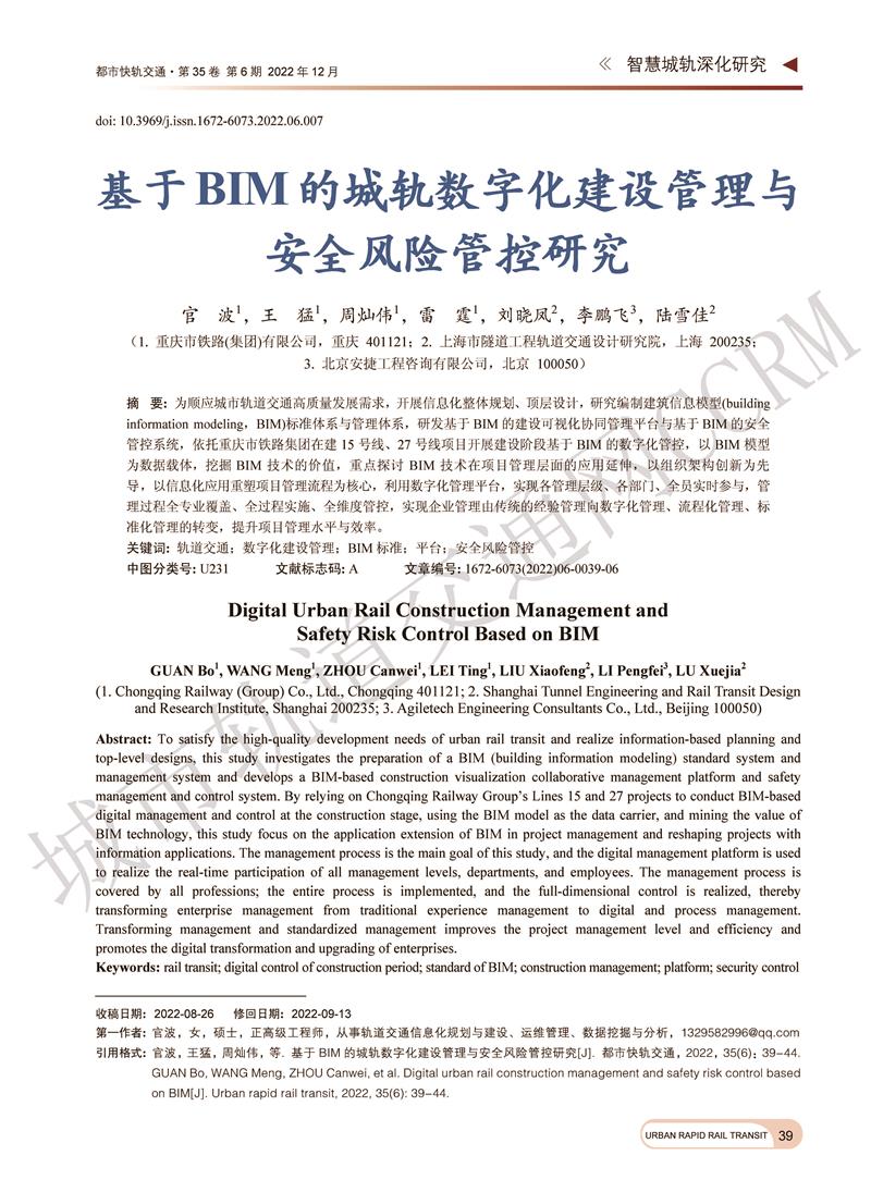 基于BIM的城轨数字化建设管理与安全风险管控研究