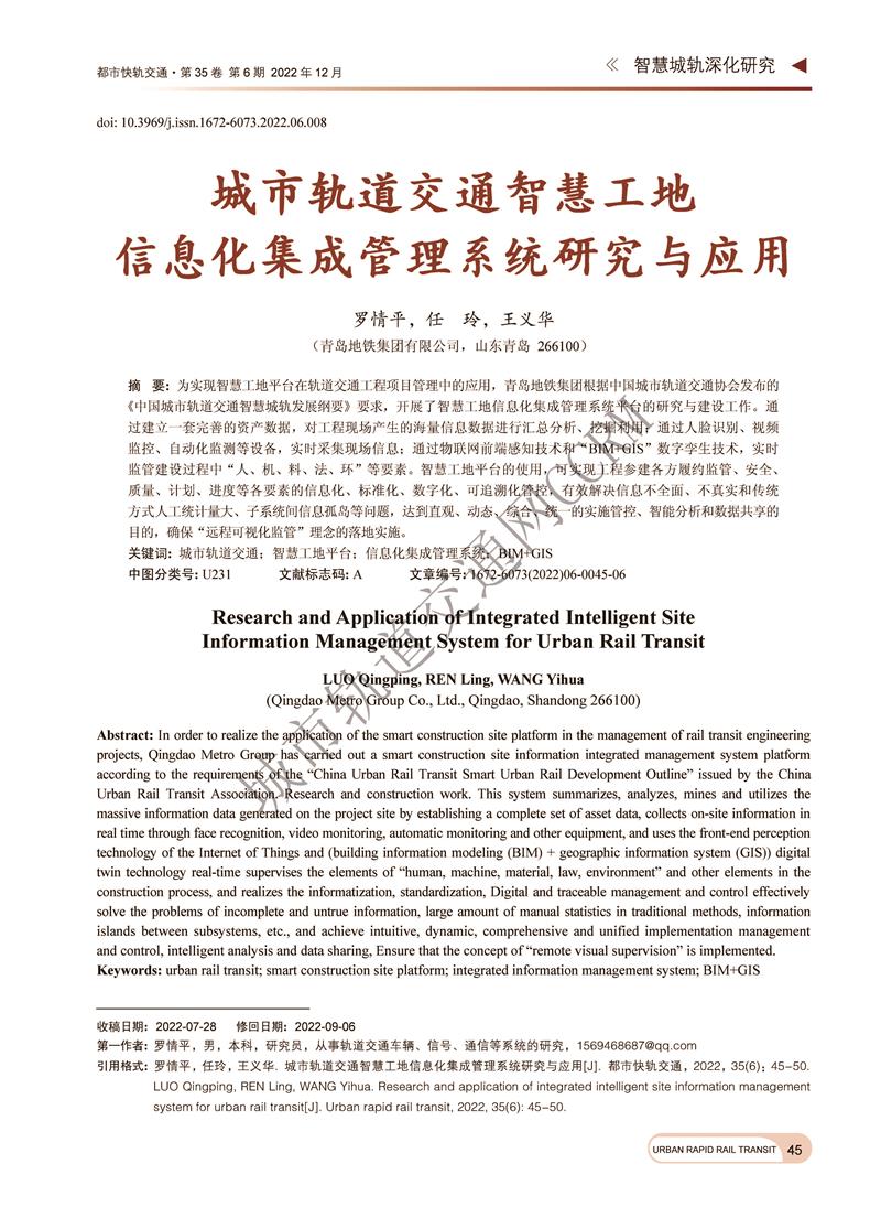 城市轨道交通智慧工地信息化集成管理系统研究与应用