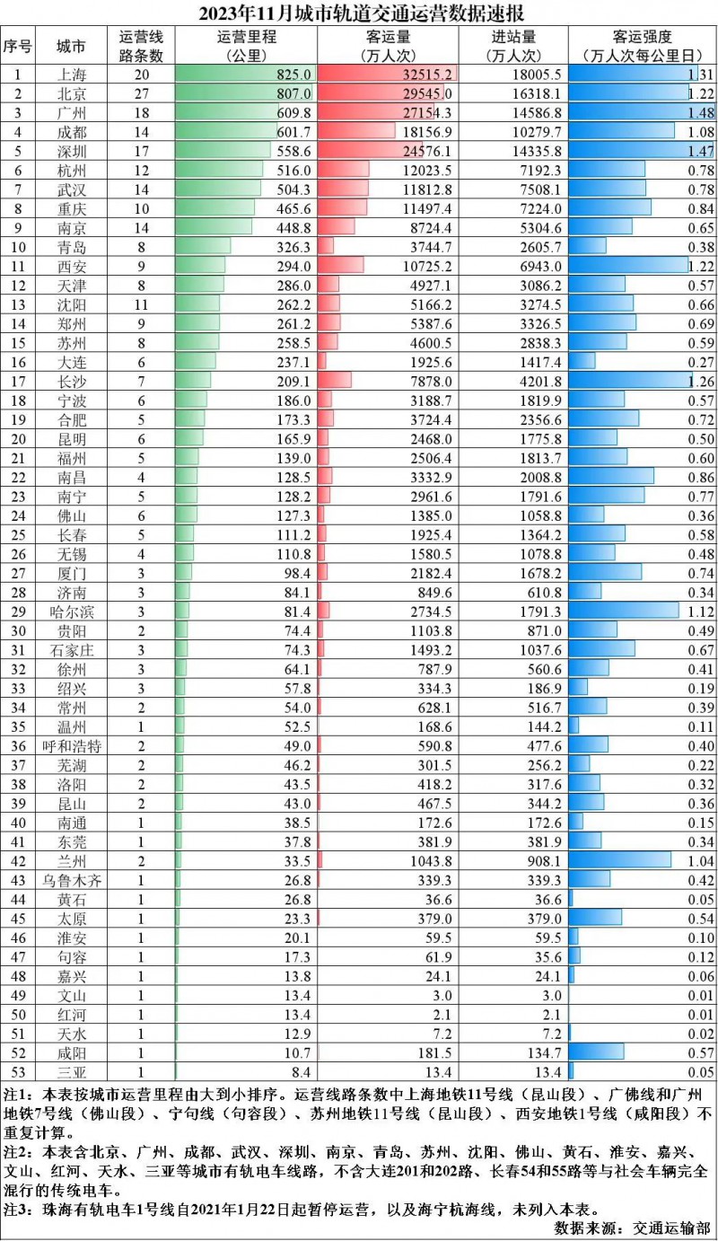2023年11月,31个省(自治区、直辖市)和新疆生产建设兵团共有55个城市开通运营城市轨道交通线路300条,运营里程9915.6公里,实际开行列车321万列次,完成客运量25.8亿人次,进站量15.5亿人次。11月份,客运量环比减少0.7亿人次、降低2.8%,同比增加11.6亿人次、增长81.9%,较2019年月均客运量增加5.9亿人次、增长29.8%。11月份全国总运营里程的平均客运强度为0.868万人次每公里日,较2019年全国总运营里程的平均客运强度降低18.1%。