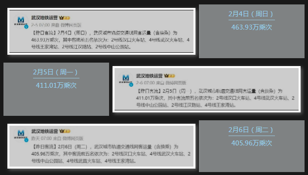 据武汉地铁运营微博消息,2月4日、5日、6日,连续三天客流量均超过400万。从数据上看,有力保障了交通出行。