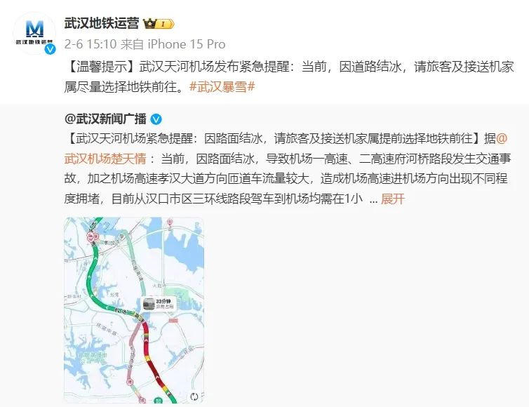 实际上,此次暴雪期间,正是机场、铁路出发和到达乘客最多的时候,受路面影响,地面交通事故频发,机场也曾紧急通知提醒乘客,尽量选择地铁前往。