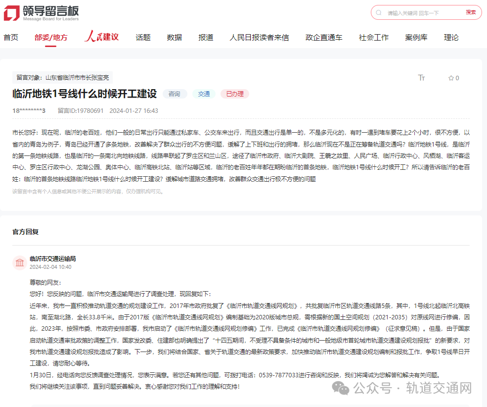 反映咨询临沂地铁1号线何时开工?