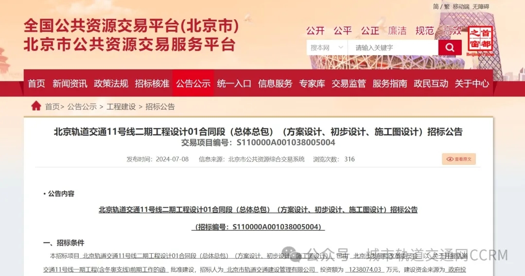 (消息由城市轨道交通网CCRM综合整合,原资讯来自北京公共资源交易中心、官方公示资讯)
