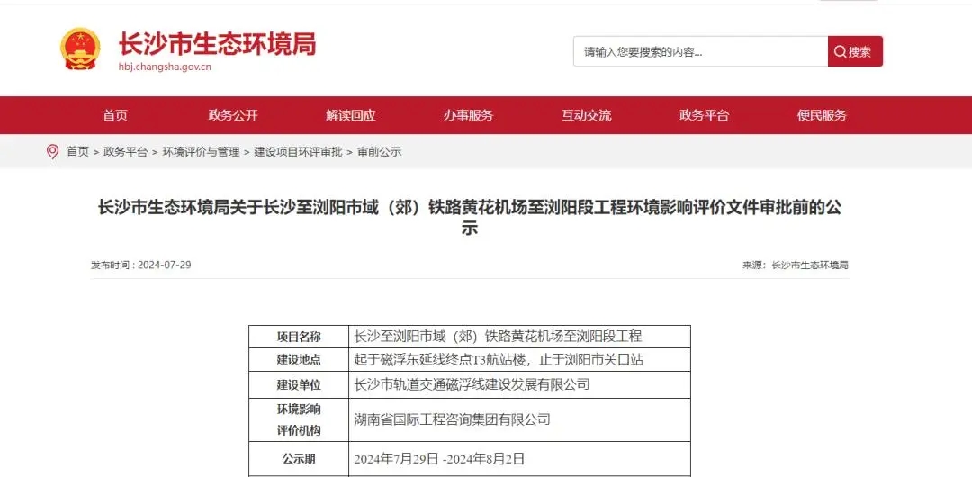 近日,长沙市生态环境局发布长沙至浏阳市域(郊)铁路黄花机场至浏阳段工程(简称“长浏快线”)环境影响评价文件审批前的公示。