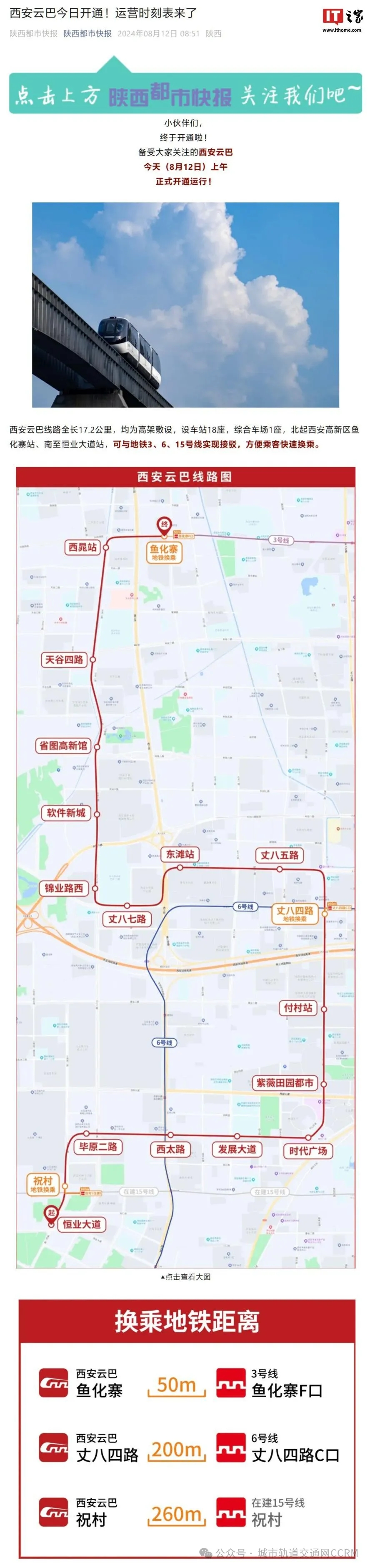 西安云巴于 8 月 12(今)日上午正式开通运行。西安云巴线路全长 17.2 公里,均为高架敷设,设车站 18 座,综合车场 1 座,北起西安高新区鱼化寨站、南至恒业大道站,可与地铁 3、6、15 号线实现接驳,方便乘客快速换乘。 据悉,西安云巴线路全长 17.2 公里,均为高架敷设,设车站 18 座,综合车场 1 座,北起西安高新区鱼化寨站、南至恒业大道站,可与地铁 3、6、15 号线实现接驳,方便乘客快速换乘。其串联了区域内陕西省图书馆高新馆区、华为研究所、紫薇田园都市、比亚迪等 70 余处产业及居住区。