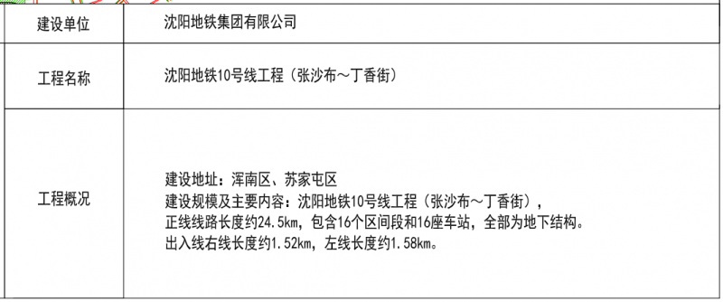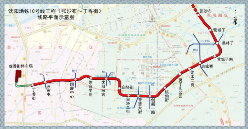 沈阳地铁10号线工程(张沙布~丁香街)为一期工程的南延伸线,起点张沙布站后区间,终至丁香街站,正线线路全长约24.5km,出入线右线长度约1.52km,左线长度约1.58km,包含16个区间段、1个出入线和16座车站,全部为地下结构。现已委托设计单位按照相关技术标准和规范完成建设工程规划设计方案,现予以公示并公开征求意见。