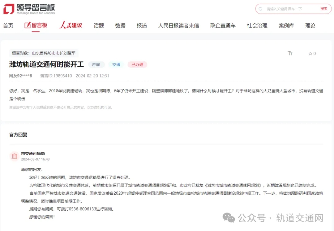 潍坊市交通运输局:为构建现代化的城市公共交通体系,前期我市组织开展了城市轨道交通项目规划研究,市政府已批复《潍坊市城市轨道交通线网规划》,近期建设规划也已编制完成。当前国家严控城市轨道交通建设,国家发改委自2020年起暂停受理全国范围内一般地级市首轮城市轨道交通项目建设规划申报工作。下一步,将密切跟踪研判国家政策调整情况,适时推进项目前期工作。