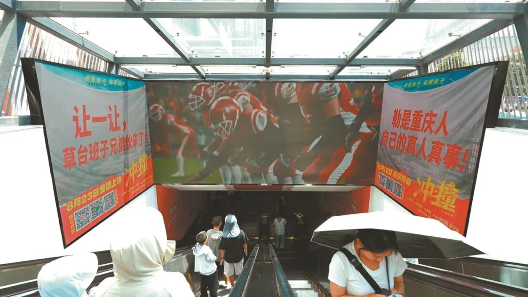 有意思的是,如此冲撞感,更是与即将上映的电影《冲·撞》不谋而合。无论是电影趣味slogan、巨幅海报,还是萦绕四周的地贴和玻璃贴,都在这里得以最大化呈现,营造出全景式视野。看似一次有力的商业价值挖掘和合作,却是城市轨道交通将闲置资源配套利用,所努力打造的城市“范本”。