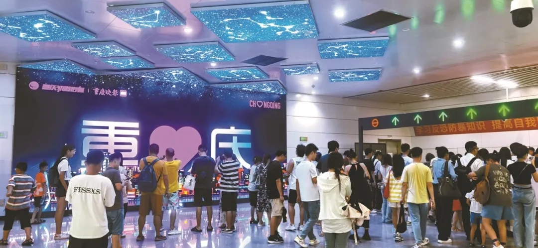 如今面向市民和游客的这处地标性打卡地,可谓科技感拉满,面积32平方米的巨幅灯箱和25平方米的天幕“星空”组合,将“重庆”两字再次点亮。