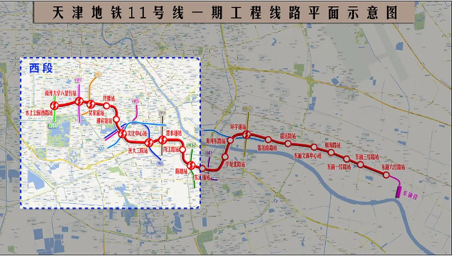 西段建成通车后可与已开通运营的东段相接,实现地铁11号线一期全线通车,有效连通中心城区与海河中游地区,对于中心城区、海河中游地区乃至天津市轨道交通系统规划以及城市发展战略的实现都有非常重大的意义。