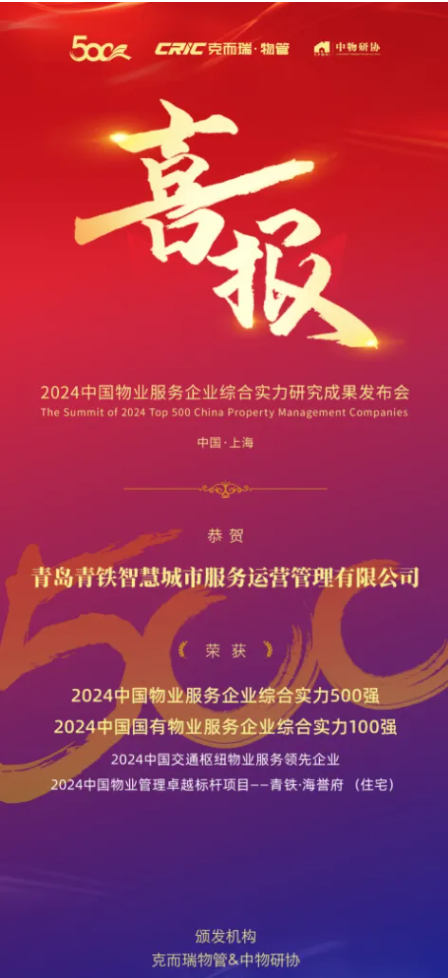 近日,2024中国物业服务企业综合实力研究成果发布会在上海举办。青岛青铁智慧城市服务运营管理公司(简称“青铁智管公司”)荣获“2024中国物业服务企业综合实力500强”“2024中国国有物业服务企业综合实力100强”“2024中国交通枢纽物业服务领先企业”多项荣誉,青铁·海誉府项目获“2024中国物业管理卓越标杆项目”,进一步以物业综合实力领域权威成果彰显公司企业实力。
