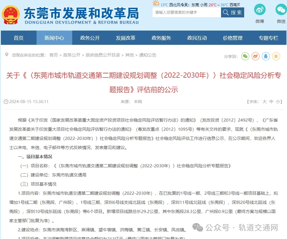 日前,东莞市发改局发布关于《〈东莞市城市轨道交通第二期建设规划调整(2022-2030年)〉社会稳定风险分析专题报告》评估前的公示。东莞市城市轨道交通第二期建设规划调整(2022-2030年)在已批复的1号线一期、2号线三期和3号线一期项目基础上,拟增加六个项目。新增项目线路总长29.2公里,其中东莞段28.3公里。 据了解,东莞市城市轨道交通第二期建设涉及东莞市滨海湾新区、麻涌镇、望牛墩镇、洪梅镇、黄江镇、长安镇、凤岗镇,拟增加的六个项目为1号线二期(东莞段、广州段)、1号线三期、深圳6号线支线北延线(东莞段),深圳11号线北延线(东莞段),深圳20号线北延线(东莞段),深圳10号线东延线(东莞段)。新增项目线路总长29.2公里,其中东莞段28.3公里,广州段0.9公里(最终方案与规模以国家主管部门批复为准)。本次调整新增项目估算总金额约为213亿元(最终以国家主管部门批复为准)。