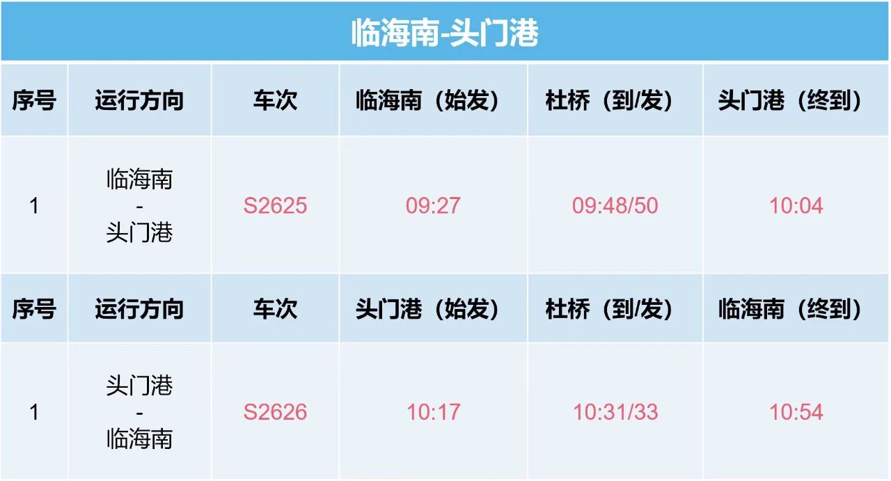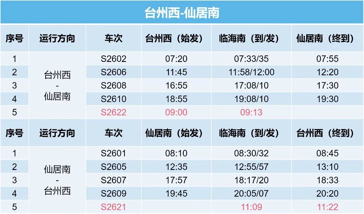 接铁路部门通知,因动车组检修需要,自11月10日(星期日)起台州市郊铁路临海南—杜桥—头门港车次S2623、S2624、S2627、S2628、S2629、S2630临时停运,同时增开台州西—临海南车次S2622。部分车次时刻有调整,具体如下表: