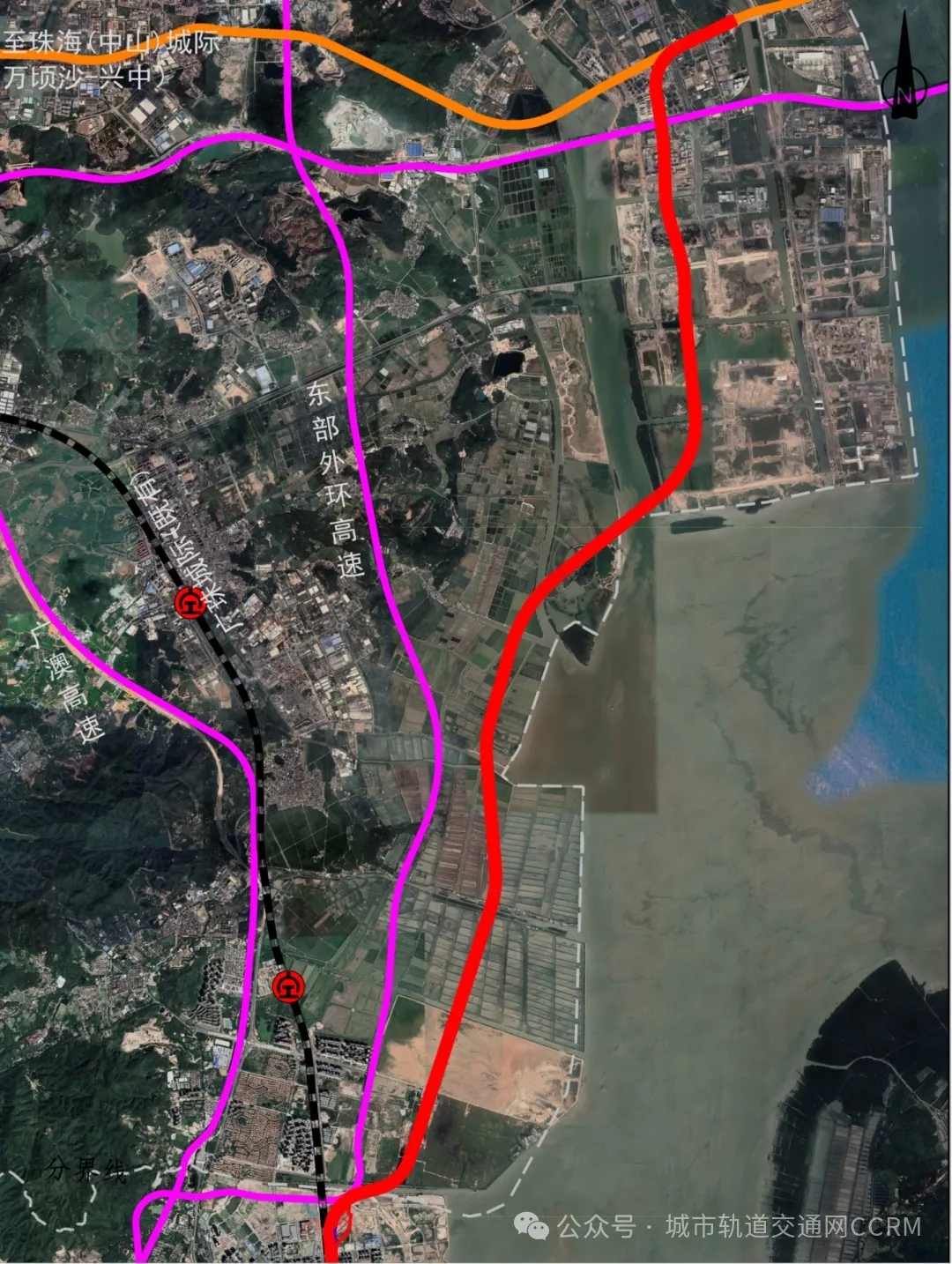 南沙至珠海(中山)城际由南沙万顷沙站往南,其后进入中山,经过香山站后分为东西两线,西线深入中山主城区至兴中站,东线沿中山东部南下进入珠海至拱北站。