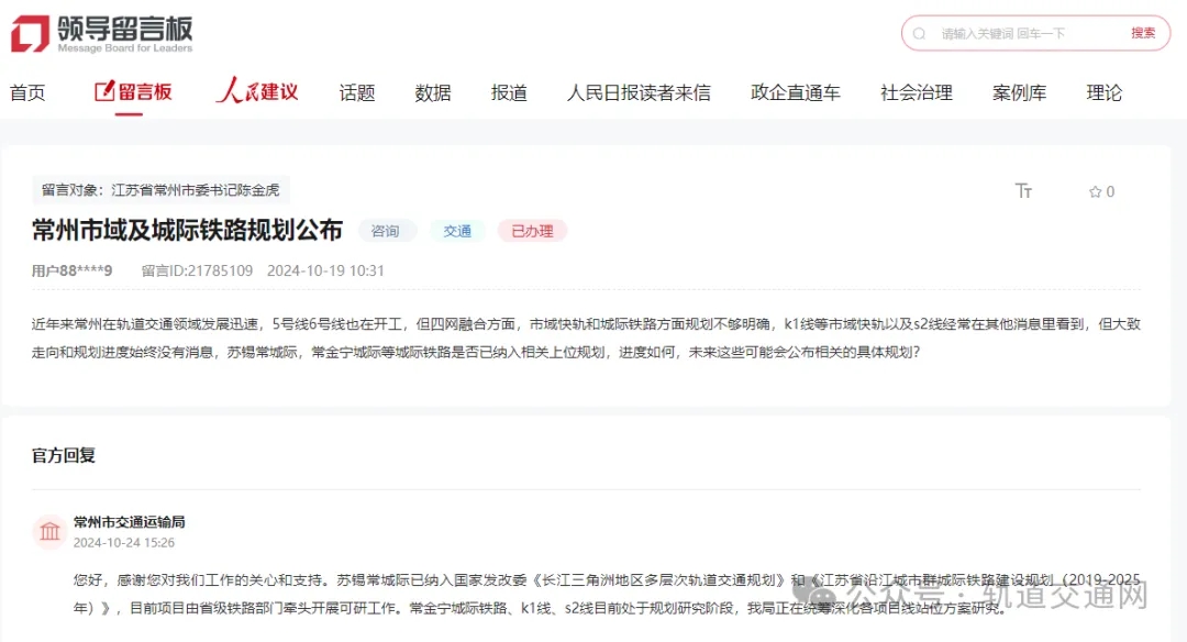 常州市交通运输局:您好,感谢您对我们工作的关心和支持。苏锡常城际已纳入国家发改委《长江三角洲地区多层次轨道交通规划》和《江苏省沿江城市群城际铁路建设规划(2019-2025年)》,目前项目由省级铁路部门牵头开展可研工作。常金宁城际铁路、k1线、s2线目前处于规划研究阶段,我局正在统筹深化各项目线站位方案研究。