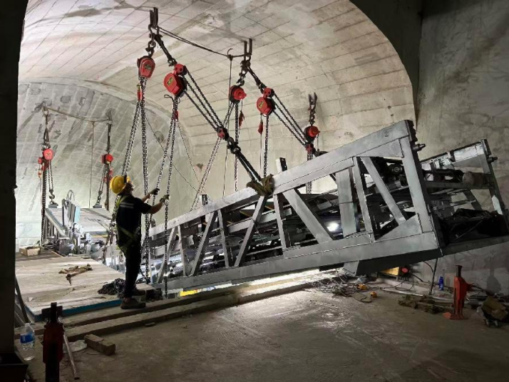 为实现扶梯的安全吊装及减少对其他专业的施工影响,广州地铁还组织参建单位和设备厂家多次讨论和协调,通过对整个运输路线和扶梯进行3D立体建模,对运输和吊装全过程进行模拟,确保吊装作业顺利进行。同时,地铁建设者们还对现场运输路线进行压平和硬化,在吊车摆放位置铺设钢板强化路面、加大吊装设备数量投入和使用大吨位吊车等方式提升效率,并且根据现场井道环境条件,采用从下往上拼接或从上往下拼接方式吊入,解决空间不足摆放问题,为设备安装创造了条件。