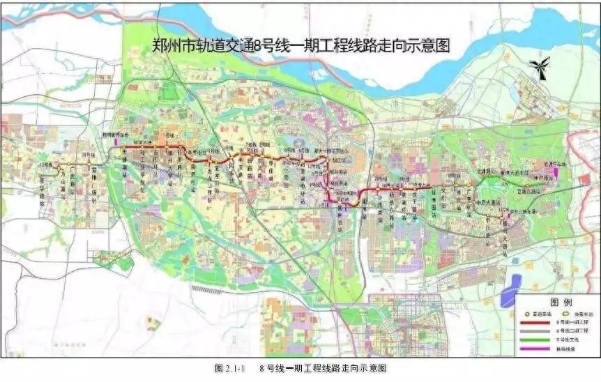 8号线一期工程呈东西走向,途经郑州高新区、中原区、金水区、郑东新区、中牟县5个区域,是郑州市已批复建设规划中最长的一条地铁线路,全长51.78km,共设28座车站,其中换乘站12座。