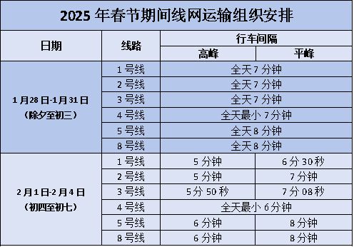 1月28日(除夕)至1月31日(初三),线网各线路全天不设置出行高峰,1、2、3、4号线全天最小行车间隔为7分钟;5号线与8号线全天行车间隔均为8分钟。