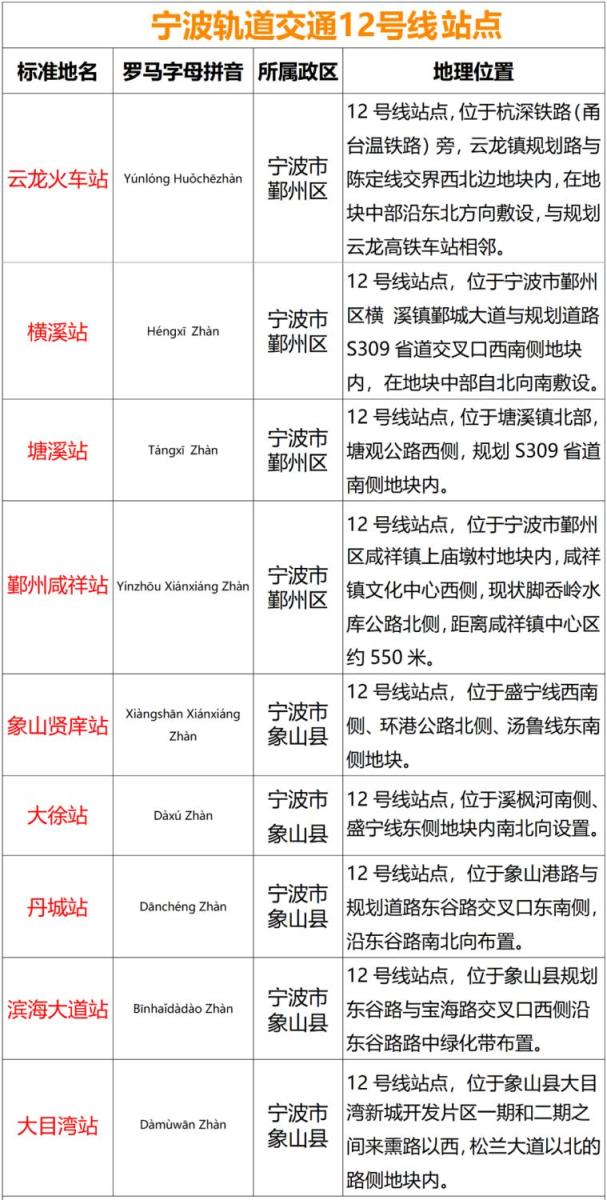 其中值得一提的是,在此前公开征集意见时市民反映比较集中的12号线咸祥、贤庠两个站点,因读音完全相同,为作区分,此次正式名称分别确定为“鄞州咸祥站”、“象山贤庠站”。