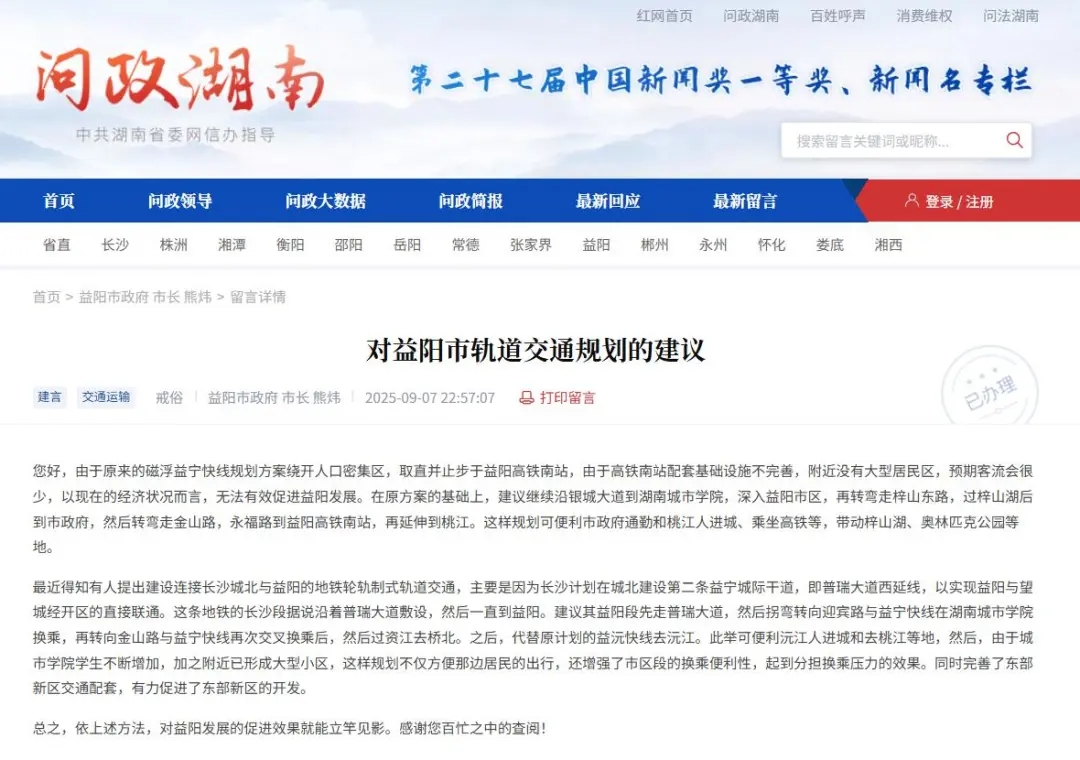 《问政湖南》网友对益阳市轨道交通规划的建议与官方回复截图。