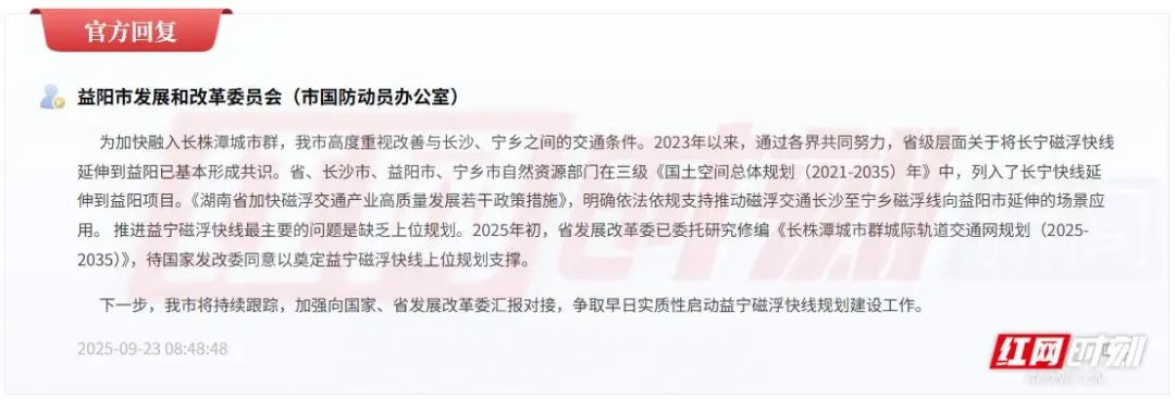近日,有网友在红网《问政湖南》栏目上留言,认为原有益宁磁浮快线规划应优化线路走向以更好服务市民出行和带动区域发展,并建议新增连接长沙城北的轨道交通线路。益阳市发展和改革委员会对此作出回应,表示益宁磁浮快线延伸项目已纳入省级规划,正在积极争取国家层面规划支持。