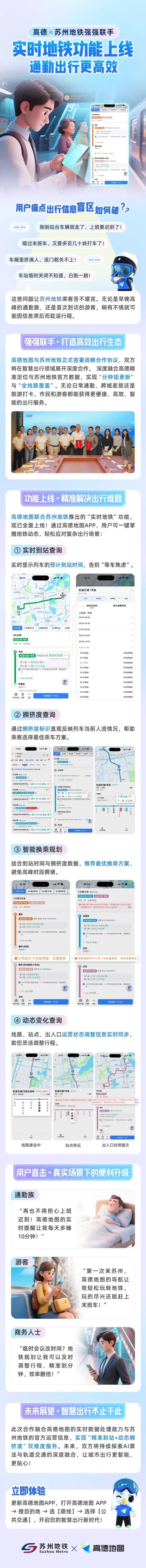 此次苏州地铁与高德地图合作主要是依托高德交通大数据能力,同时利用互联网技术、云计算等领域的先进技术,结合苏州地铁线网监测能力,围绕运营信息发布、公众出行诱导服务等方面开展。高德地图APP将根据苏州地铁运营数据,创新推出“实时地铁”功能,用户可通过APP实现地铁实时到站查询、列车实时拥挤度查询以及地铁智能换乘路径规划、地铁运营动态信息变化查询,无论是日常通勤、跨城出差,还是旅游打卡,用户均可轻松应对出行难题。