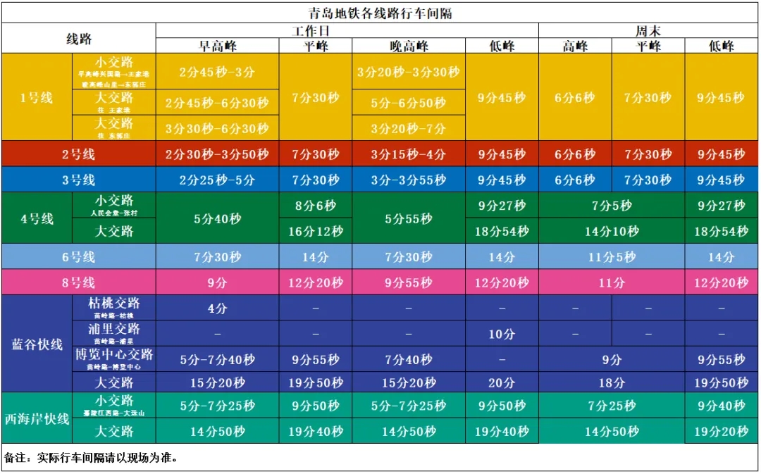 同时,为匹配市民出行需求,青岛地铁优化运力配置,各线路工作日、周末行车间隔均调整。其中工作日20:20之后,原蓝谷快线部分由苗岭路站始发、终到博览中心站的小交路列车,终点站将调整为浦里站,请您乘车前留意列车终到信息,避免耽误行程。您可通过青岛地铁APP获取列车计划到站信息,提前规划行程。