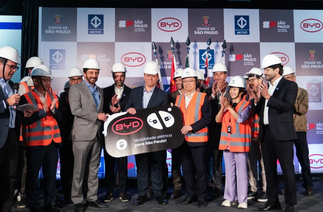 当地时间2025年10月8日,比亚迪董事长兼总裁王传福在巴西圣保罗现场考察了正在进行测试的地铁17号黄金线比亚迪云轨项目,并在同日向圣保罗市市长Ricardo Nunes正式交付首台22米长、搭载比亚迪刀片电池的纯电动铰接式大巴。圣保罗州州长Tarcísio de Freitas、比亚迪执行副总裁李柯、比亚迪集团多位高管与圣保罗地铁公司团队代表共同出席了这次活动。