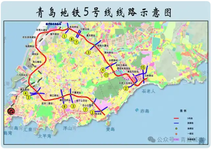 目前,青岛地铁在建线路8条、154公里。其中,地铁5号线是串联青岛中心区轨道交通网络的“C”形线路,全长32.6公里,设站27座,连接市南区、市北区、崂山区,与多条线路实现换乘。