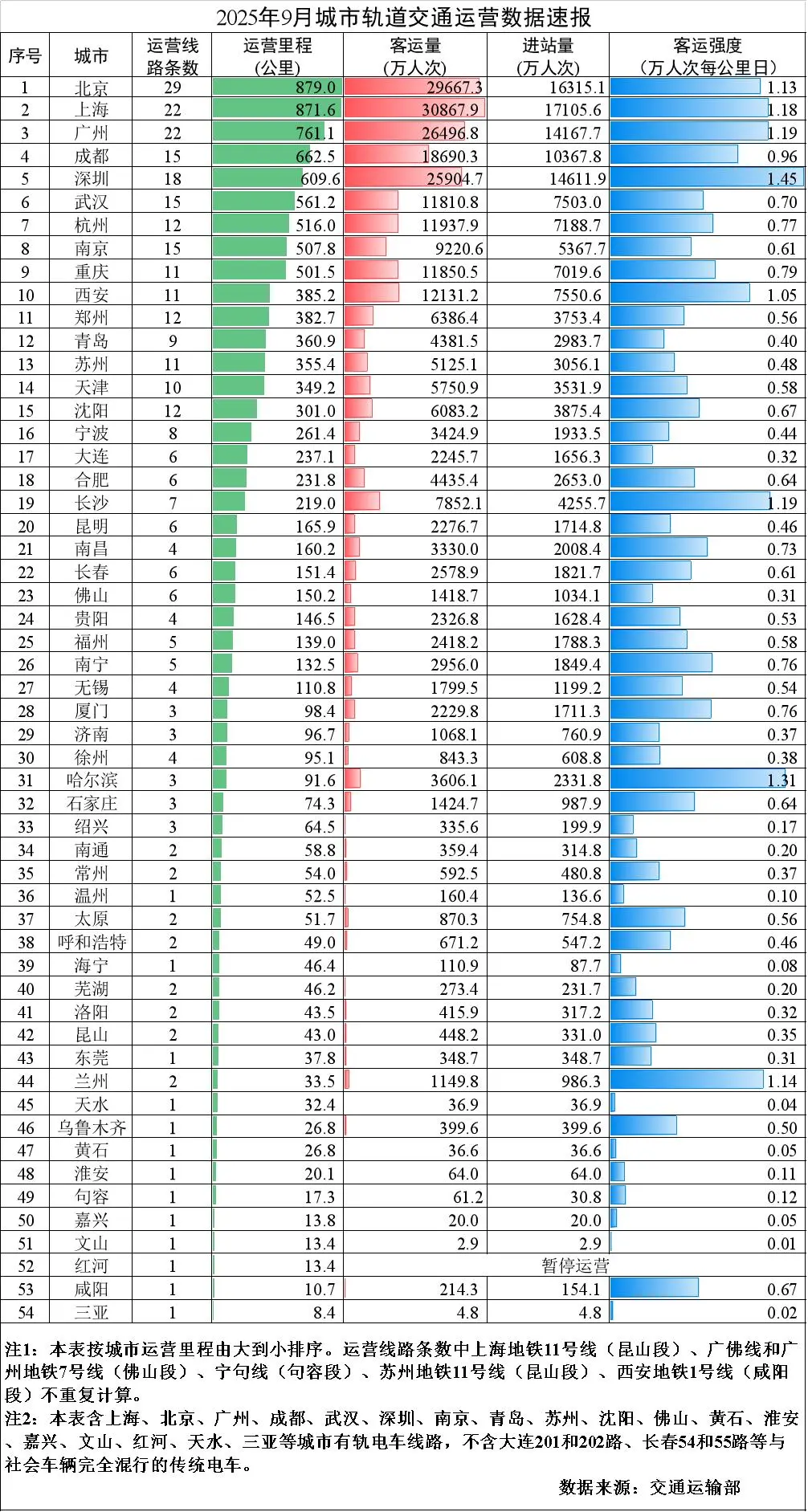 2025年9月,31个省(自治区、直辖市)和新疆生产建设兵团共有54个城市开通运营城市轨道交通线路333条,运营里程11330.5公里,实际开行列车364万列次,完成客运量26.9亿人次,进站量16亿人次。9月份,客运量环比减少1.9亿人次,降低6.6%,同比增加1.1亿人次,增长4.3%。9月份全国总运营里程的平均客运强度为0.799万人次每公里日,环比降低3.9%,同比降低3.3%。 其中,43个城市开通运营地铁、轻轨线路274条,运营里程9839.3公里,完成客运量26亿人次,进站量15.4亿人次;16个城市开通运营单轨、磁浮、市域快速轨道交通线路25条,运营里程970.7公里,完成客运量7757万人次,进站量5221万人次;18个城市开通运营有轨电车、自动导向轨道线路34条,运营里程520.5公里,完成客运量962万人次,进站量908万人次。