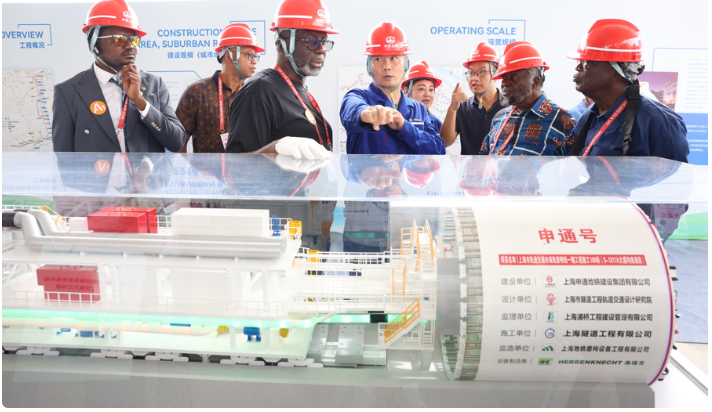 “欢迎大家从世界各地齐聚上海,参观在建的城市轨道交通工程!23号线一期工程景联路站及相连区间,设置了4个展示点,请观摩我们的设计建造技术成果。期待在交流中碰撞思维火花,共同为全球城市轨道交通事业发展添砖加瓦。”37位外宾上午抵达在建的景联路站后,申通地铁建设集团副总经理陆晨致欢迎辞,随后由中铁五局海外事业部员工介绍技术成果。