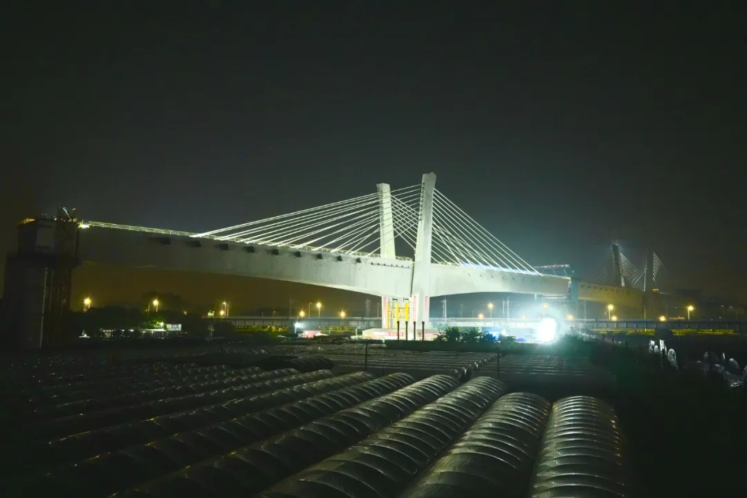 10月16日凌晨,随着两台液压连续张拉千斤顶持续精准牵引“发力”, 由广州地铁集团负责建设管理、中铁广投总承包管理、中铁广州局承建的珠三角城际轨道交通广佛环线佛山西站至广州北站段工程(以下简称“广佛西环城际”)全线唯一转体桥——官窑西南涌特大桥(124+230+124)米斜拉桥犹如空中“芭蕾舞者”平稳旋转,顺利转体跨越广珠铁路、广佛肇高速公路等重要建构筑物,实现“毫米级”精准对接,标志着项目控制性节点取得重大突破,为全线桥梁贯通奠定了坚实基础。