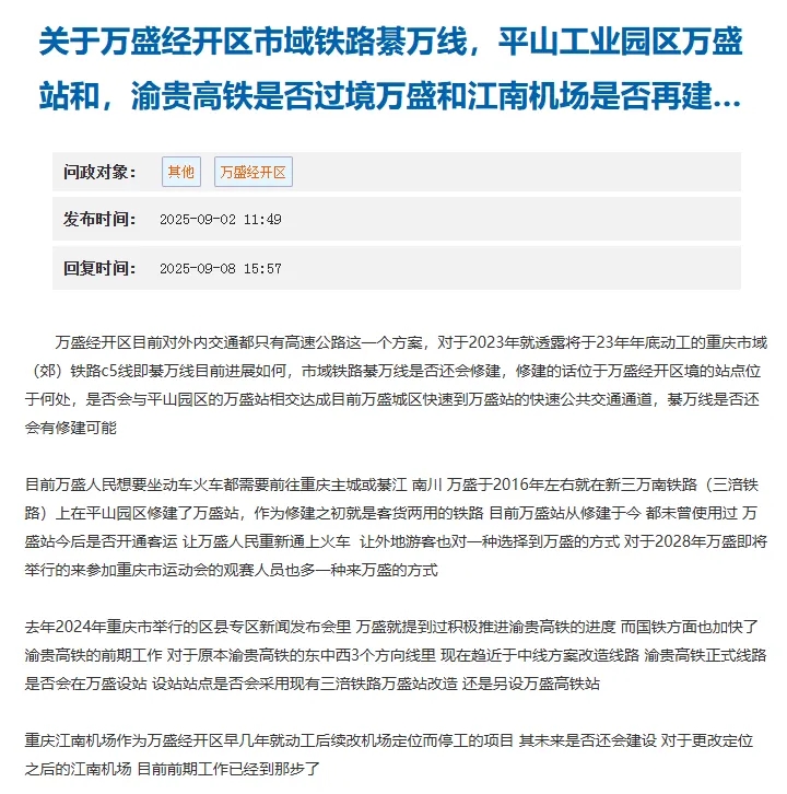 规划设计|官方最新回复:重庆市域铁路C5线(綦万线)何时开工?