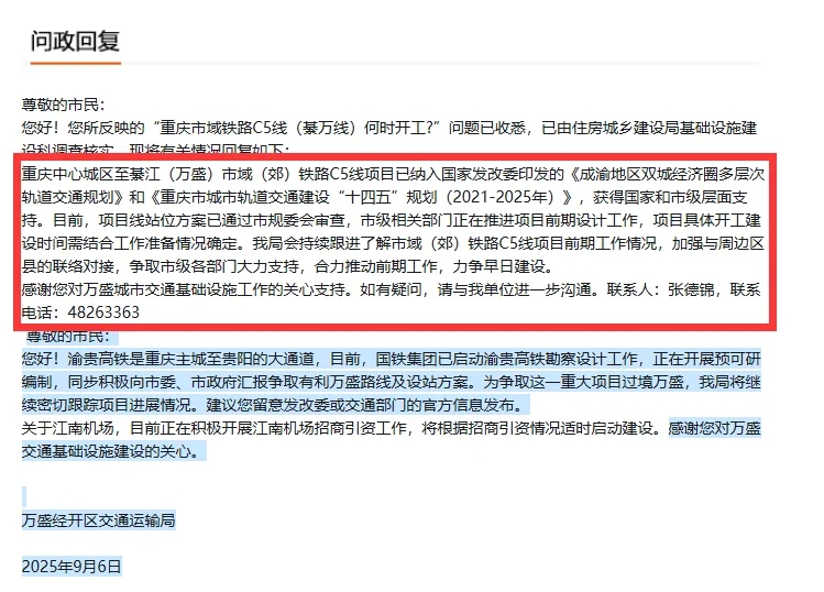 近日,重庆市万盛经开区交通运输局在回复网友提问时称,重庆中心城区至綦江(万盛)市域(郊)铁路C5线项目已纳入国家发改委印发的《成渝地区双城经济圈多层次轨道交通规划》和《重庆市城市轨道交通建设“十四五”规划(2021-2025年)》,获得国家和市级层面支持。目前,项目线站位方案已通过市规委会审查,市级相关部门正在推进项目前期设计工作,项目具体开工建设时间需结合工作准备情况确定。我局会持续跟进了解市域(郊)铁路C5线项目前期工作情况,加强与周边区县的联络对接,争取市级各部门大力支持,合力推动前期工作,力争早日建设。
