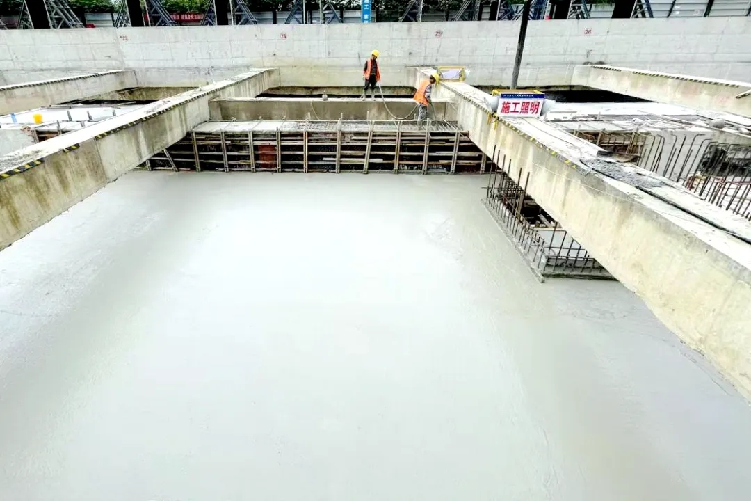 ▲作业人员对车站顶板混凝土进行收面抹光,严控浇筑平整度与密实度,为后续防水层施工奠定坚实基础。
