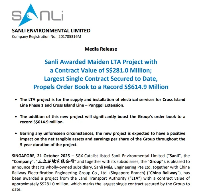 10月21日,新加坡三立环境有限公司发布公告,宣布其全资子公司与中国中铁电气化局集团有限公司联合中标新加坡陆路交通管理局LTA地铁项目,合同总额约2.81亿新元(约合2.17亿美元)。这是三立环境有限公司自成立以来获得的最大单笔合同,也是其首次承接LTA项目,标志着公司在公共基础设施领域迈出重要一步。 该项目涵盖新加坡跨岛地铁线一期及跨岛线-榜鹅延伸段的电气系统供应与安装工作,合同周期为5年。三立环境有限公司表示,与中铁电气化局集团有限公司的合作将结合双方在技术与项目执行方面的专长,提高项目交付效率与风险管理水平。