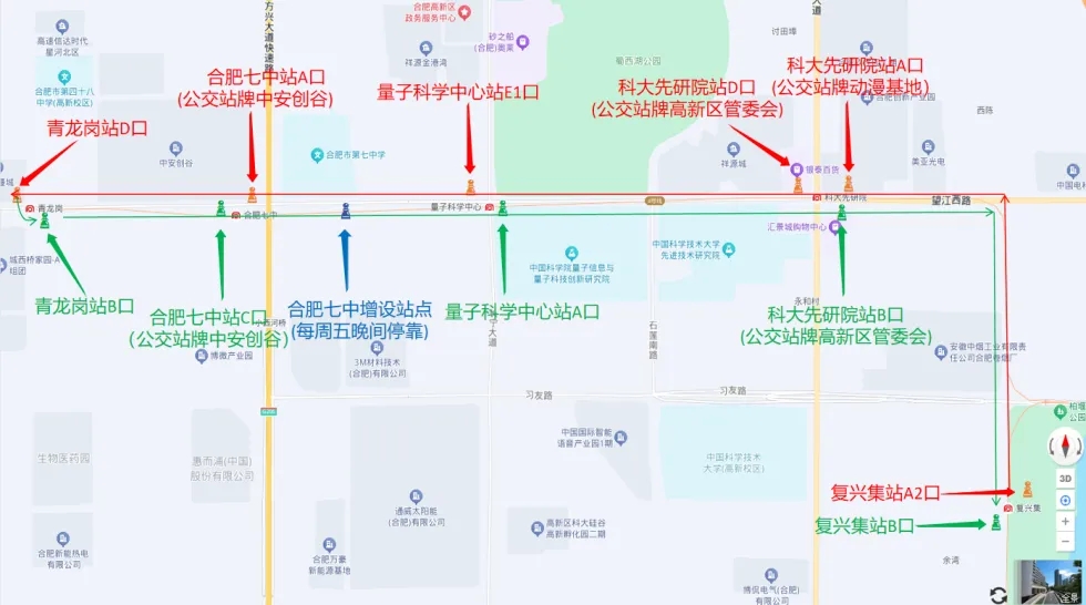 复兴集站A2口、科大先研院A口/D口、量子科学中心站E1口、合肥七中站A口、青龙岗站D口