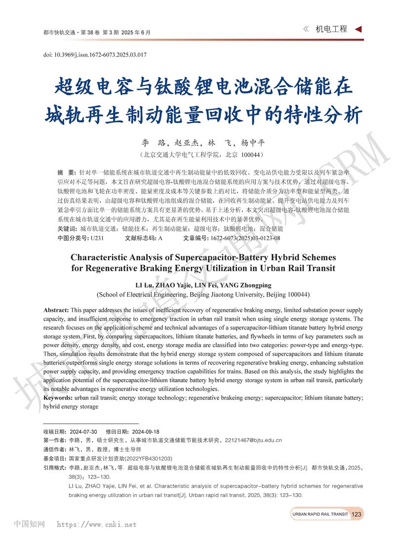 超级电容与钛酸锂电池混合储能在城轨再生制动能量回收中的特性分析