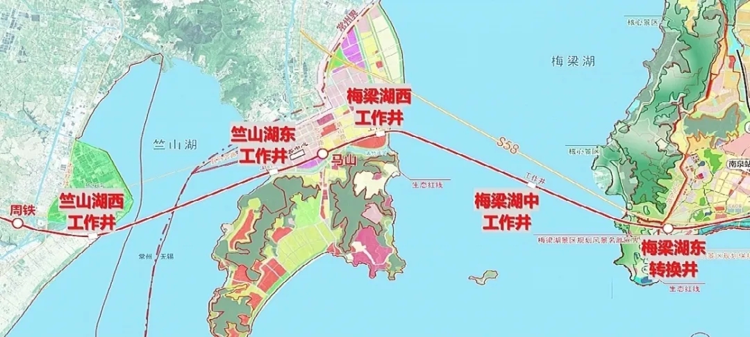线路介绍 S2线全长61.48公里,其中大盾构段长达21.6公里,将分别下穿梅梁湖水域、竺山湖水域以及马山镇。根据设计方案,该工程设竺山湖西工作井、竺山湖东工作井、梅梁湖西工作井、梅梁湖中工作井、梅梁湖东转换井,总共将投入4台超大直径盾构机进行掘进施工,采用被誉为盾构技术皇冠上的明珠——大直径泥水盾构技术。
