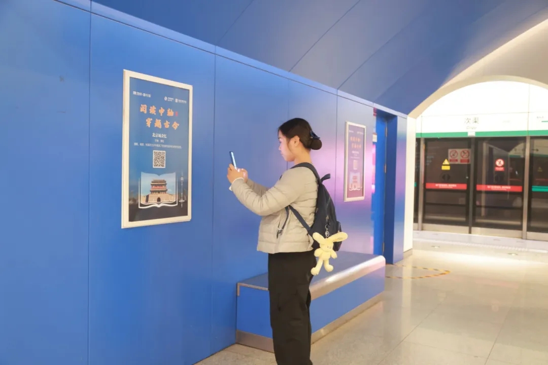 17号线次渠站,随着一辆列车进站,不少乘客走出地铁,步入宽敞的站台。路过一处蓝色的拱形空间时,乘客晶晶被墙壁上挂着的一排海报吸引了。海报主题为“阅读中轴,穿越古今”,每幅海报上都推荐了一本与中轴文化相关的书籍,同时配有一个二维码。这样的“阅读空间”,在该站站厅里也有。