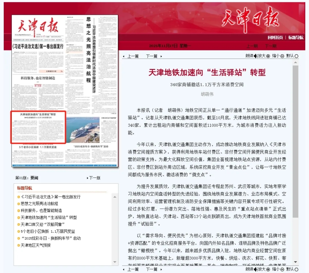 11月17日,《天津日报》头版,对天津地铁加速向“生活驿站”转型,招引进驻340家商铺,激活1.1万平方米消费空间进行报道。
