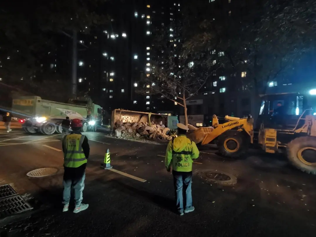 事故发生时正值交通晚高峰,倾泻的渣土占据多股车道,车辆通行极为困难。面对突发情况,青岛地铁5号线福宁立交站项目部立即启动应急联动机制,由负责人带队,组织7名施工人员及1台装载机、2台出渣车火速赶往现场。救援队伍与交警协同作战,通过机械清运与人工辅助相结合的方式,高效清理路面渣土,逐步恢复道路通行能力。经过近4小时的连续奋战,至21时,事故路段渣土全部清除完毕,交通秩序完全恢复。