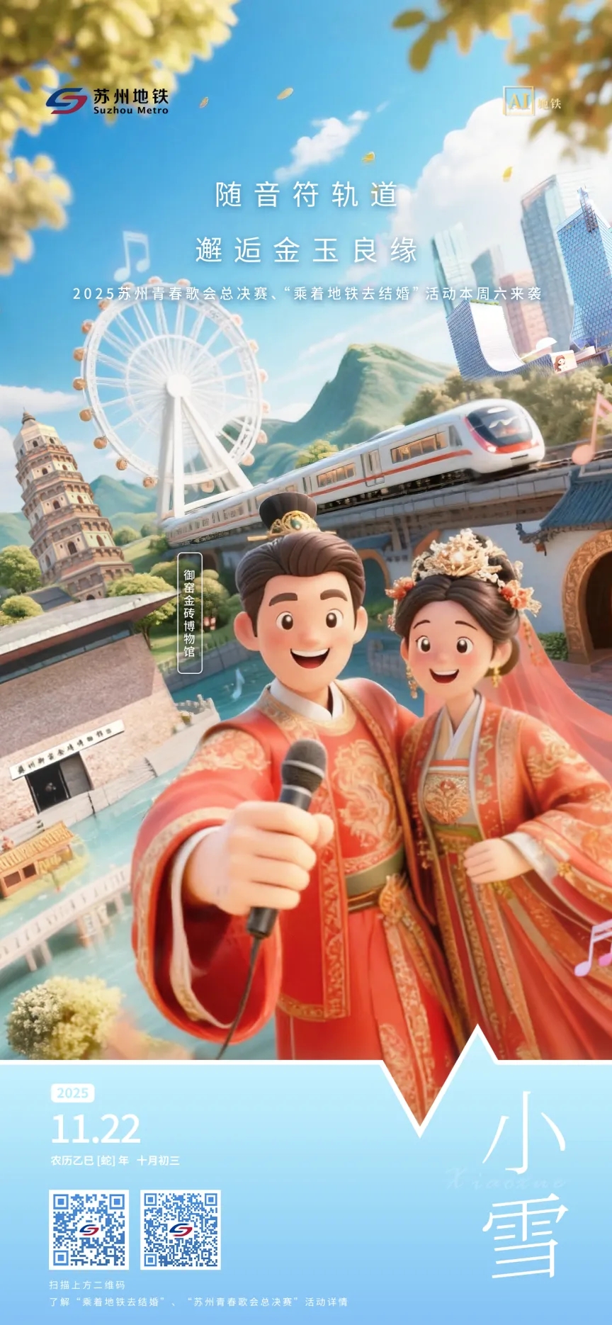 “乘着地铁去结婚——11·22「一」乘地铁,金御「良」缘苏式传统婚俗体验活动作为“乘着地铁去结婚”城市品牌下的又一创新之作,此次与新希望双喜品牌再度携手,共拓“甜蜜经济”新篇章,活动延续“2天1夜”的沉浸式婚旅体验模式,串联地铁交通、非遗技艺与城市地标,以“1122”为爱情密码,寓意“一生一世一双人”,深度融合国家级非遗“御窑金砖”文化,公开招募11对“幸福合伙人”乘着地铁开启一段浪漫旅程。 古今交融,以城为礼——沉浸式婚旅拉开序幕11月21日,“幸福合伙人”身着新中式服装,在汇星连·广济南路站开启一场穿越之旅。巡游队伍共同乘坐6号线1122结婚主题专列,在行进的车厢中品味苏州昆剧院表演的昆曲快闪;在白洋湾山歌韵律中对歌牵线;登临千年虎丘,在塔影园林间定格坚贞瞬间;最后,新人入住苏州悦季元来酒店,在这座兼具艺术氛围与建筑美学的空间中度过温馨夜晚。一日行程融合非遗、园林与城市漫游,为次日的苏式婚礼静心序写前章。