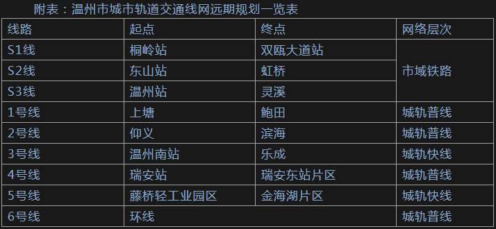 远期线网由9条线组成,包括市域铁路S1~S3线,以及城市轨道交通1~6号线。全网总规模约498公里,其中市域铁路总规模约202公里,城市轨道交通总规模约296公里。远景规划线路覆盖温州市未来发展潜力区域,规划至外围城镇的延伸线或延伸条件,并规划市域铁路至都市区青田和省内相邻区域的通道。