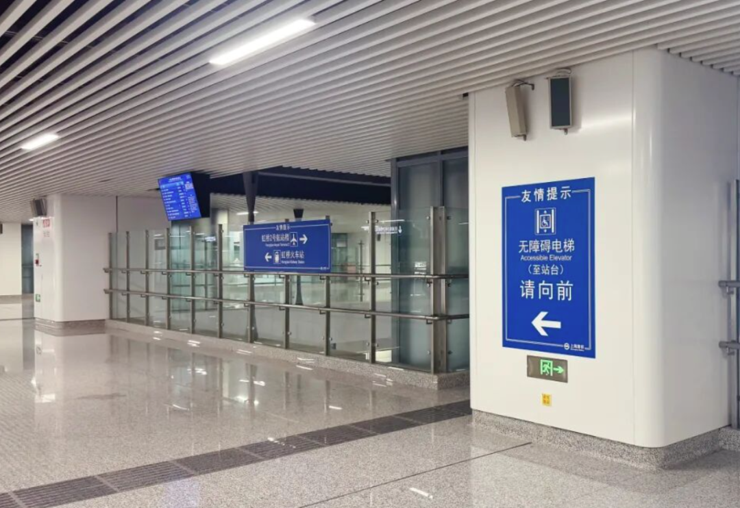 作为长三角重要综合交通枢纽,虹桥2号航站楼站汇聚地铁2号线、10号线及市域机场线,日均客流量大且换乘路径复杂。此次导向升级重点强化市域机场线进出站视觉引导,在B1层南北进站大厅入口处扩大标识尺寸、增大线路名称字体,采用高对比度色彩设计,方便乘客远距离快速识别,有效减少误乘情况。同时,在费区外立柱、公告栏旁等五类高频点位新增12处友情提示标识,优化2处既有标识,实现关键区域提示全覆盖。针对换乘及无障碍群体需求,车站新增10处无障碍电梯指引标识和20处换乘导向标识,构建连续通行路径,缩短绕行距离,44处新增及调整的标识形成了覆盖进站、换乘、出站全流程的立体化引导体系。“一眼就能看清方向,不用担心走错路。” 首次乘坐市域机场线的王女士点赞道。