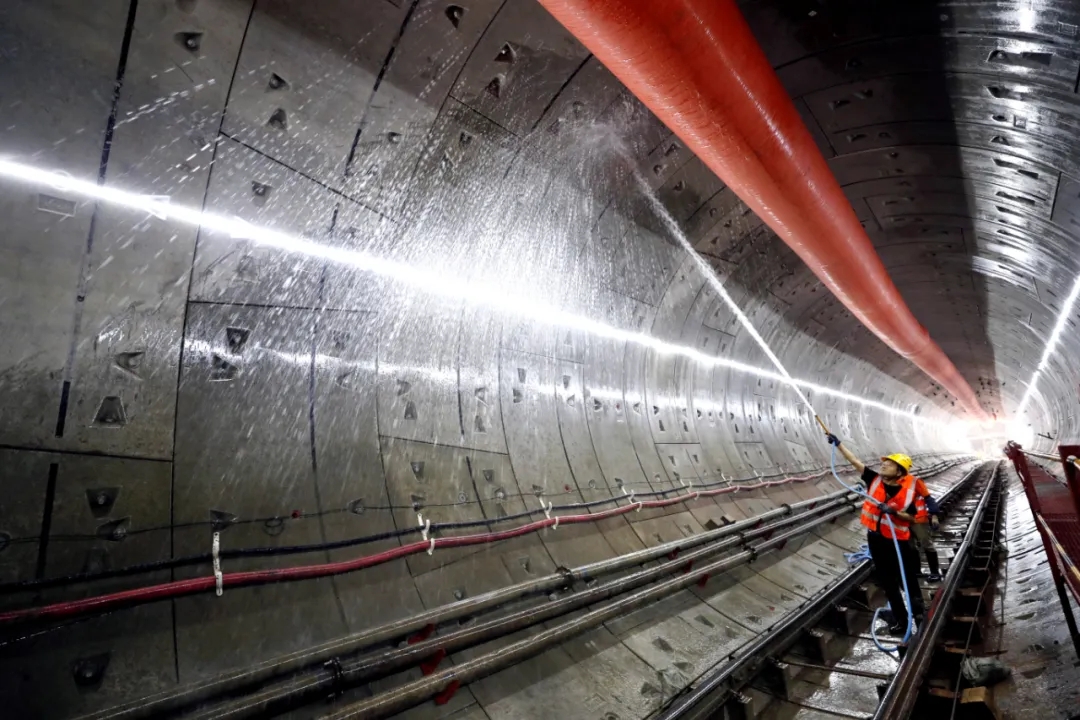 11号线四期汤山站至四新大道站左线隧道已安全推进400米,施工人员正在清洁管片。