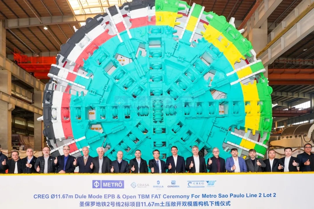 近日,巴西圣保罗地铁2号线2标项目11.67m土压敞开双模盾构机下线仪式在中国举行,该款盾构机由中铁装备制造,刷新了此前同样由其创下的南美洲最大直径盾构机记录,这也是其为圣保罗地铁2号线项目提供的第二台超大直径盾构机,预计将于明年上半年开挖佩尼亚至杜特拉之间7公里隧道,为线路首次延伸至瓜鲁柳斯市打下基础。 业主方圣保罗地铁公司代表与项目合作方CRASA-GHELLA-CONSBEM联合体代表出席下线仪式。