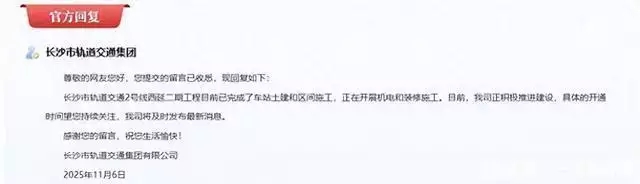 近日,有网友咨询该线路具体开通运营时间,询问2025年底前开通的网传消息是否属实,并了解工程当前进度、是否存在推进困难及施工时间表等情况。长沙轨道交通集团也做出了最新回应。