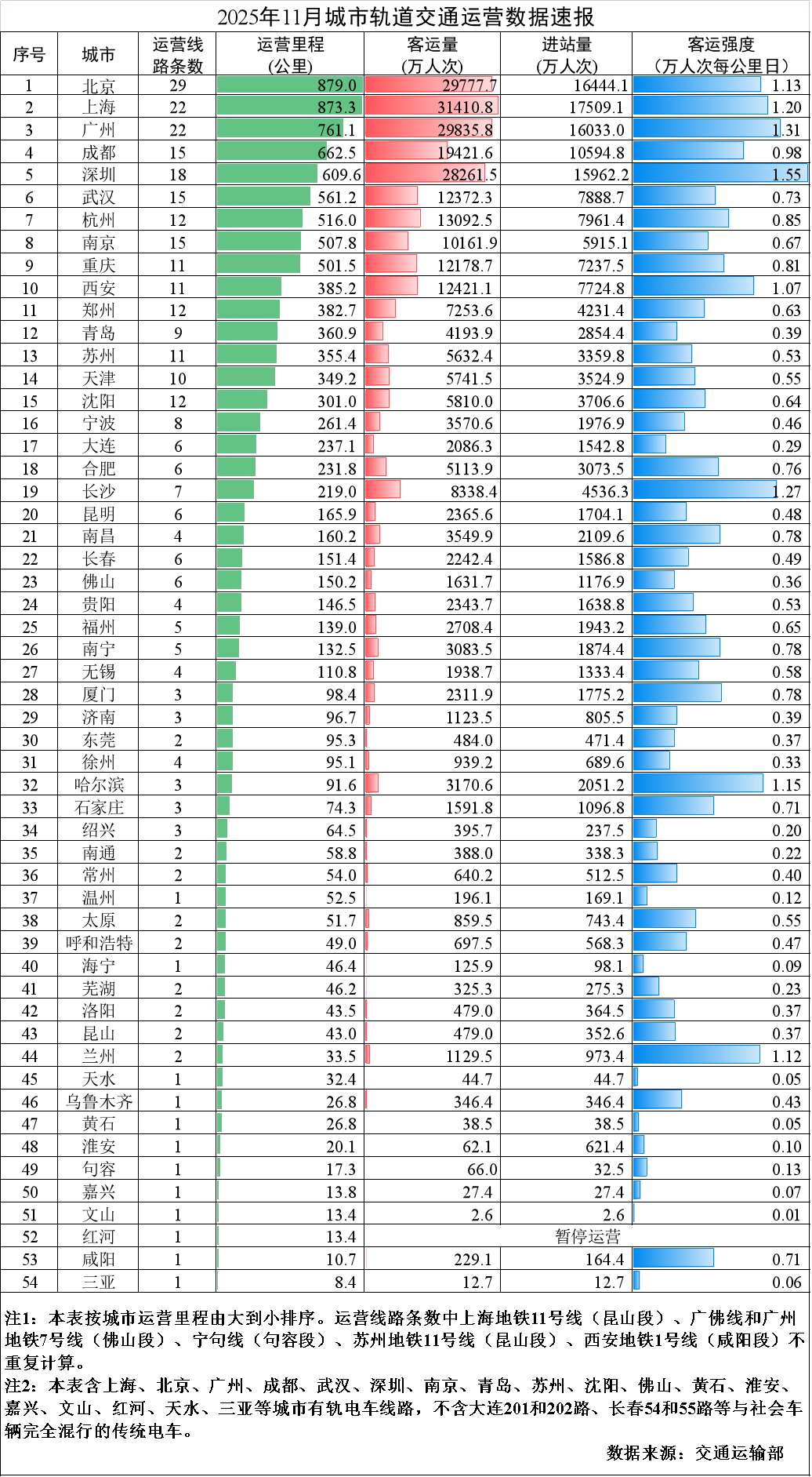 2025年11月,31个省(自治区、直辖市)和新疆生产建设兵团共有54个城市开通运营城市轨道交通线路334条,运营里程11389.7公里,实际开行列车362万列次,完成客运量28.3亿人次,进站量16.8亿人次。11月份,客运量环比增加0.1亿人次,增长0.4%,同比增加1.2亿人次,增长4.4%。11月份全国总运营里程的平均客运强度为0.832万人次每公里日,环比增长3.5%,同比降低3.3%。 其中,43个城市开通运营地铁、轻轨线路275条,运营里程9898.5公里,完成客运量27.3亿人次,进站量16.1亿人次;16个城市开通运营单轨、磁浮、市域快速轨道交通线路25条,运营里程970.7公里,完成客运量8283万人次,进站量5597万人次;18个城市开通运营有轨电车、自动导向轨道线路34条,运营里程520.5公里,完成客运量1137万人次,进站量1642万人次。
